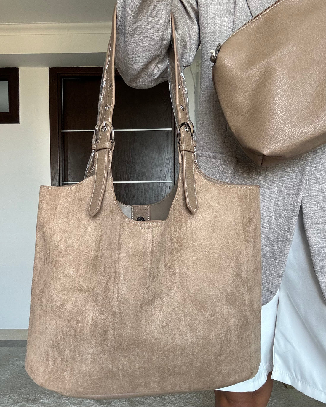 Borsa Maxi shopper con pochette interna e tracolla light camel