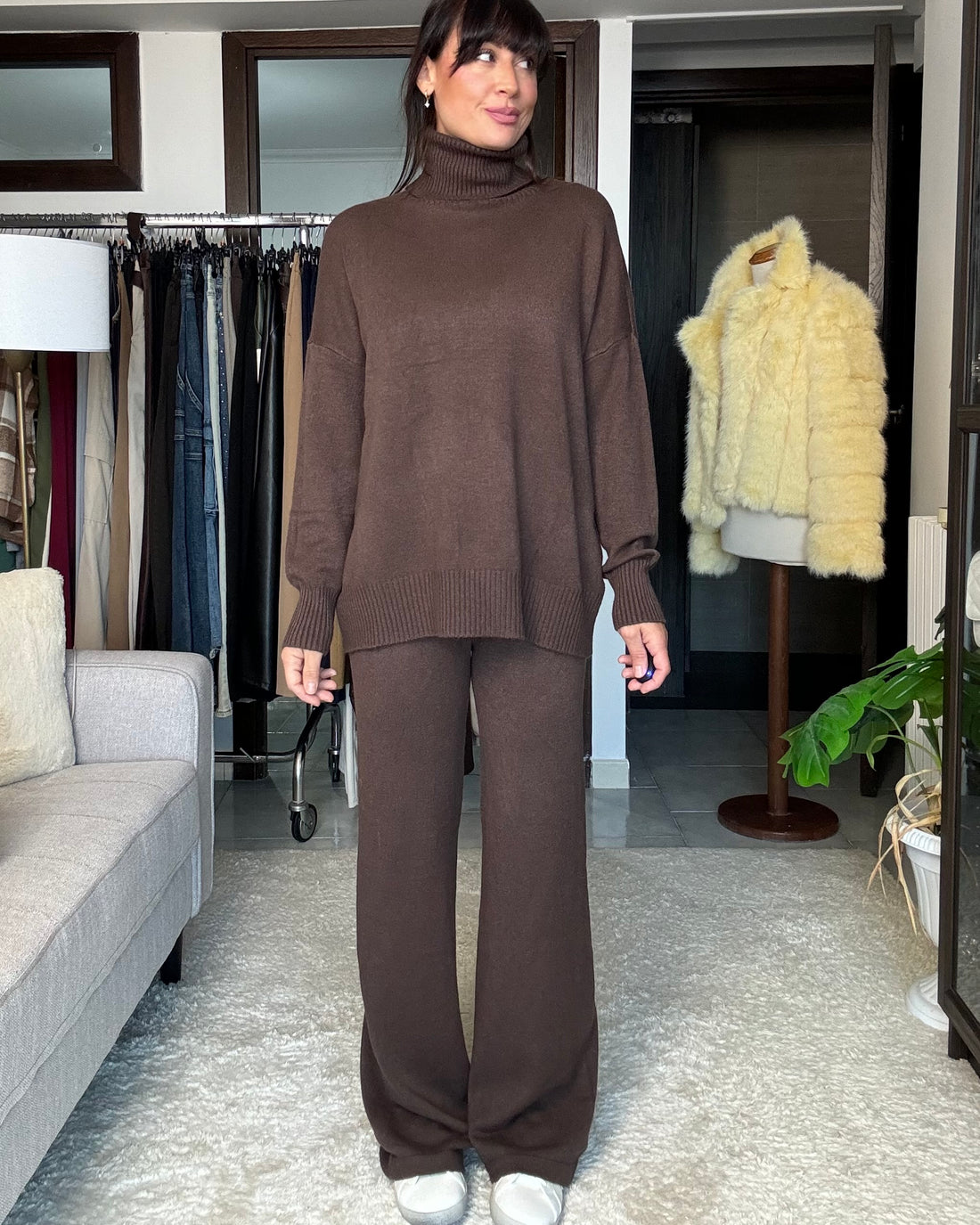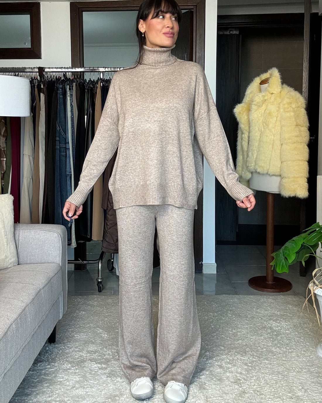 Coordinato lanetta rasata due pezzi composto da pullover collo alto e pantalone morbido con elastico...