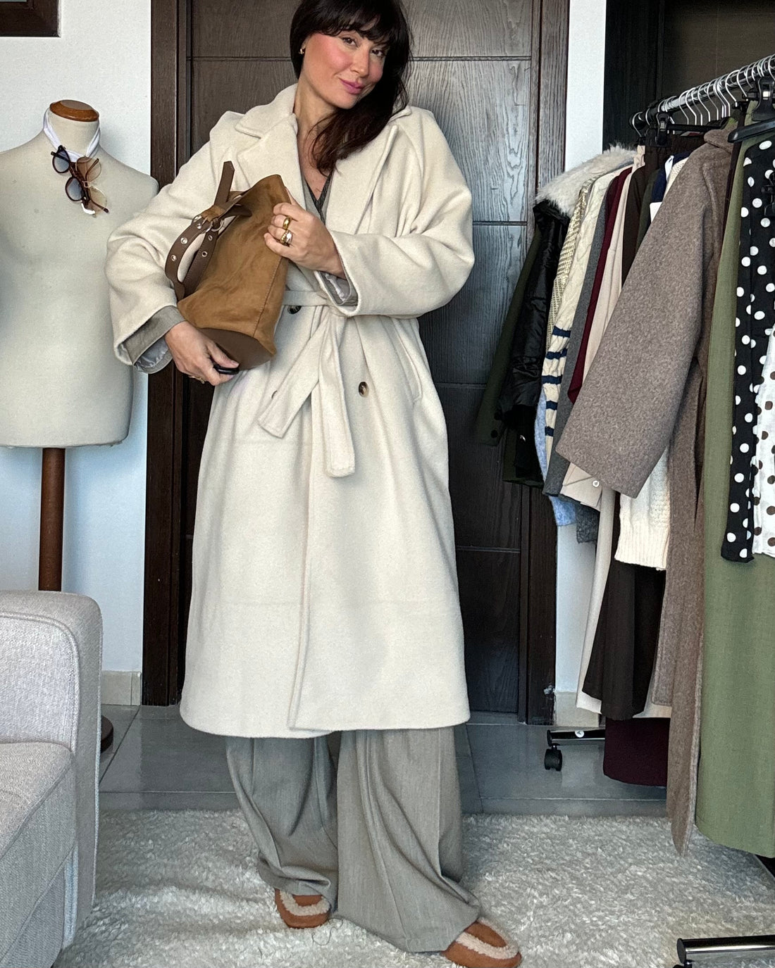 Cappotto leggermente oversize doppio petto con fit molto morbido e scivoloso . collo revers cintura...