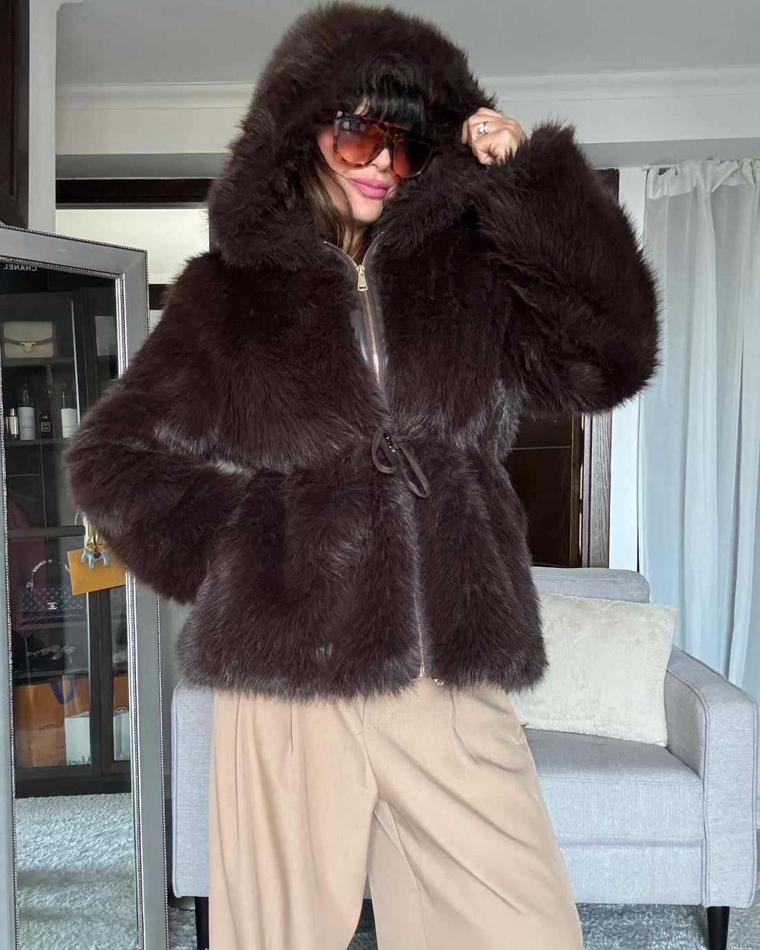 Pelliccia top quality effetto visone realistico Vita regolabile con laccetti Cappuccio e cerniera La pelliccia...