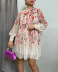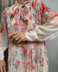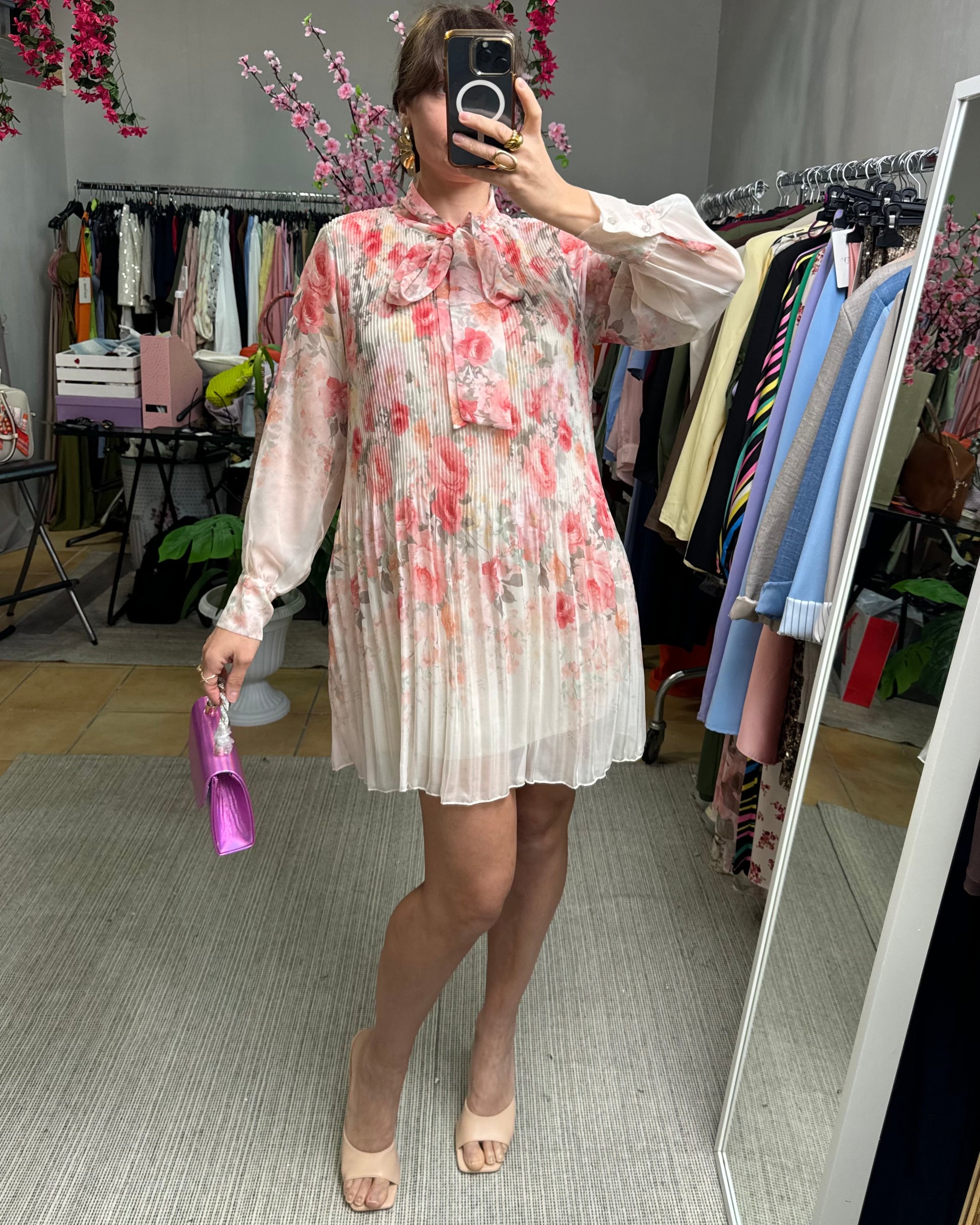 Abito chic e raffinato , plissettato con motivo floreale giallo e lilla .