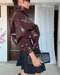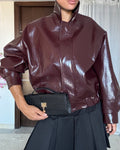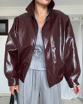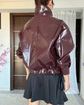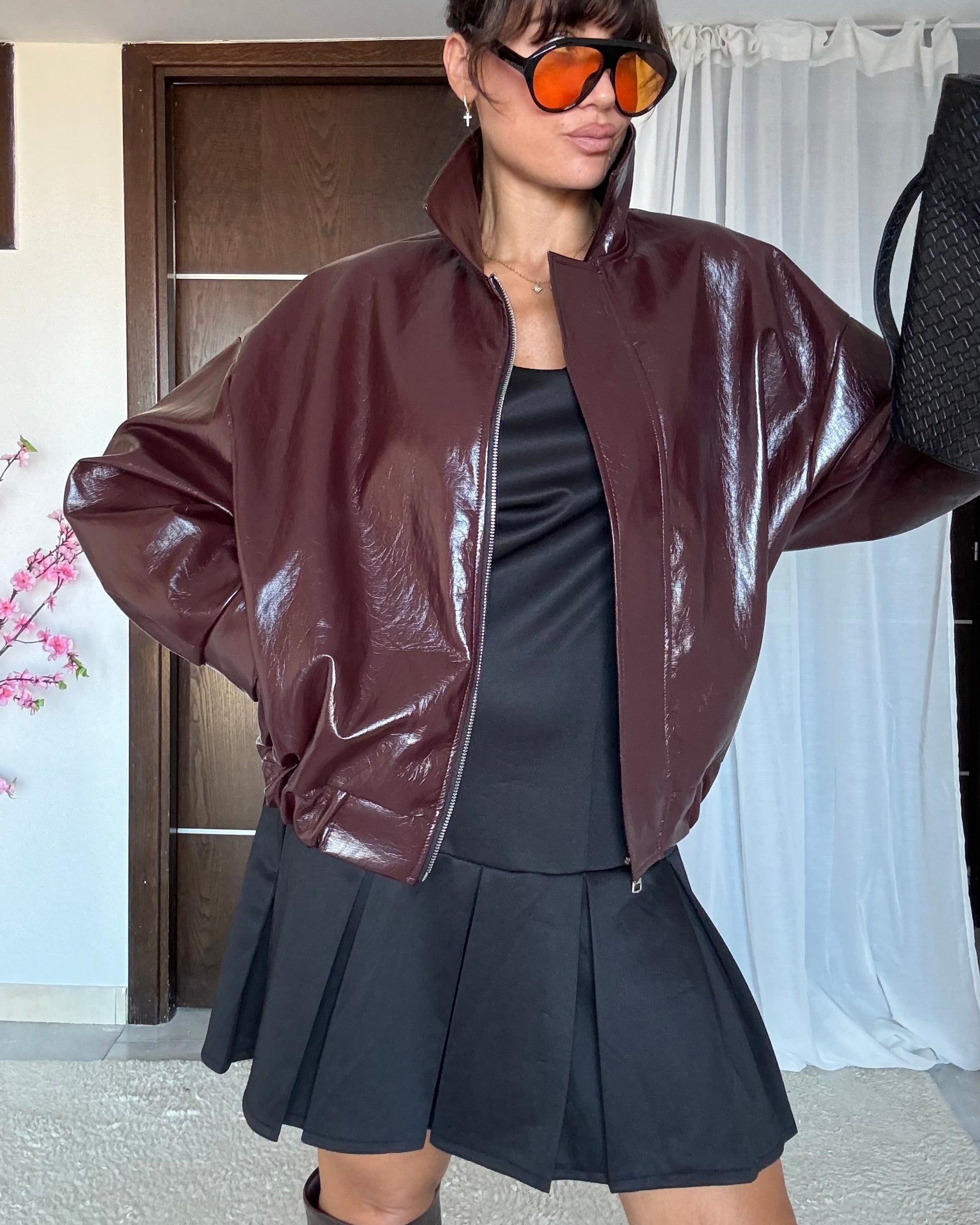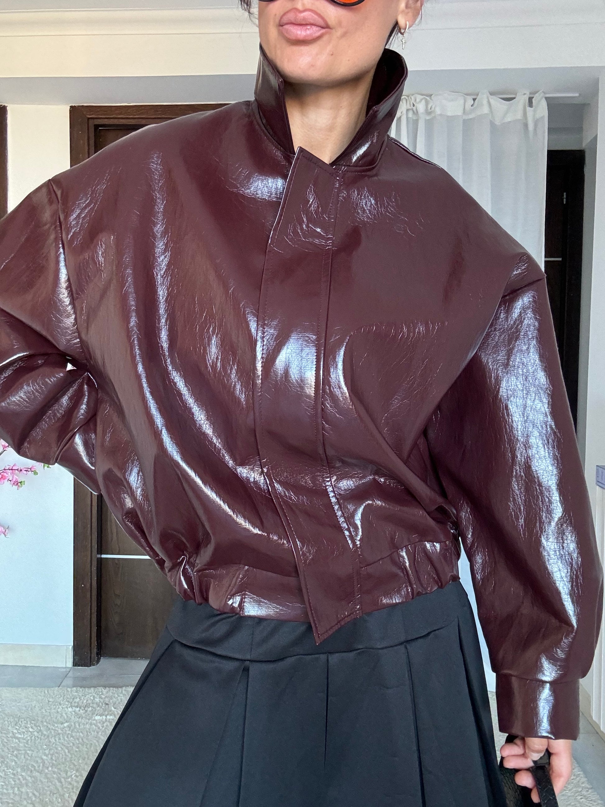 Bomber cropped in ecopelle lucida con zip e tasche filo invisibili laterali .