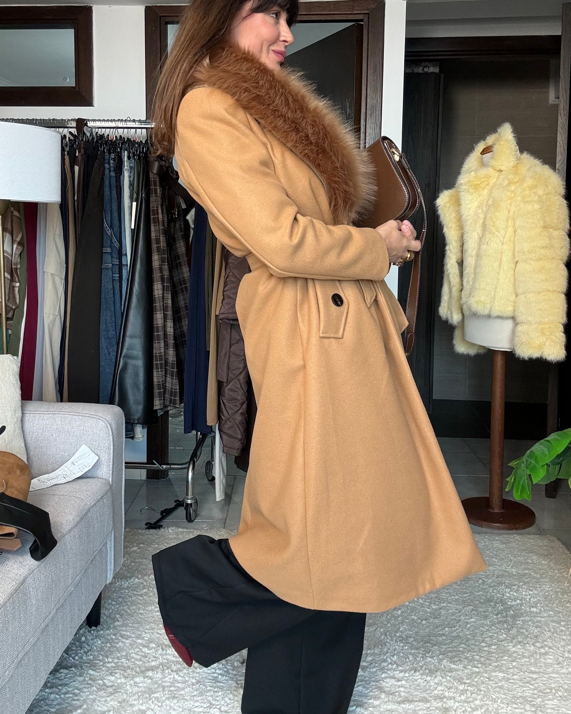 Cappotto Camel con collo eco pelliccia rimovibile