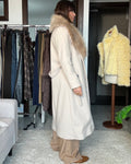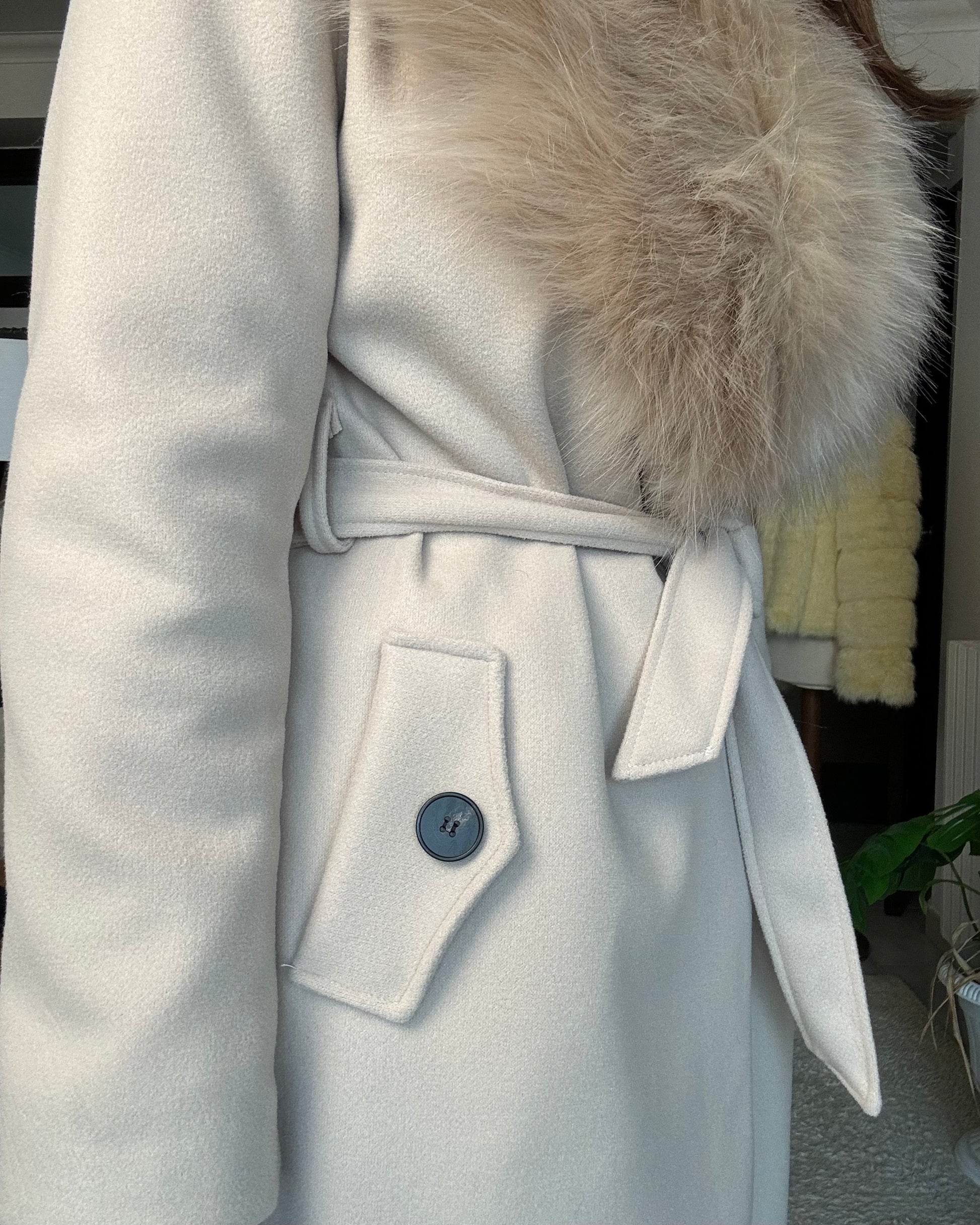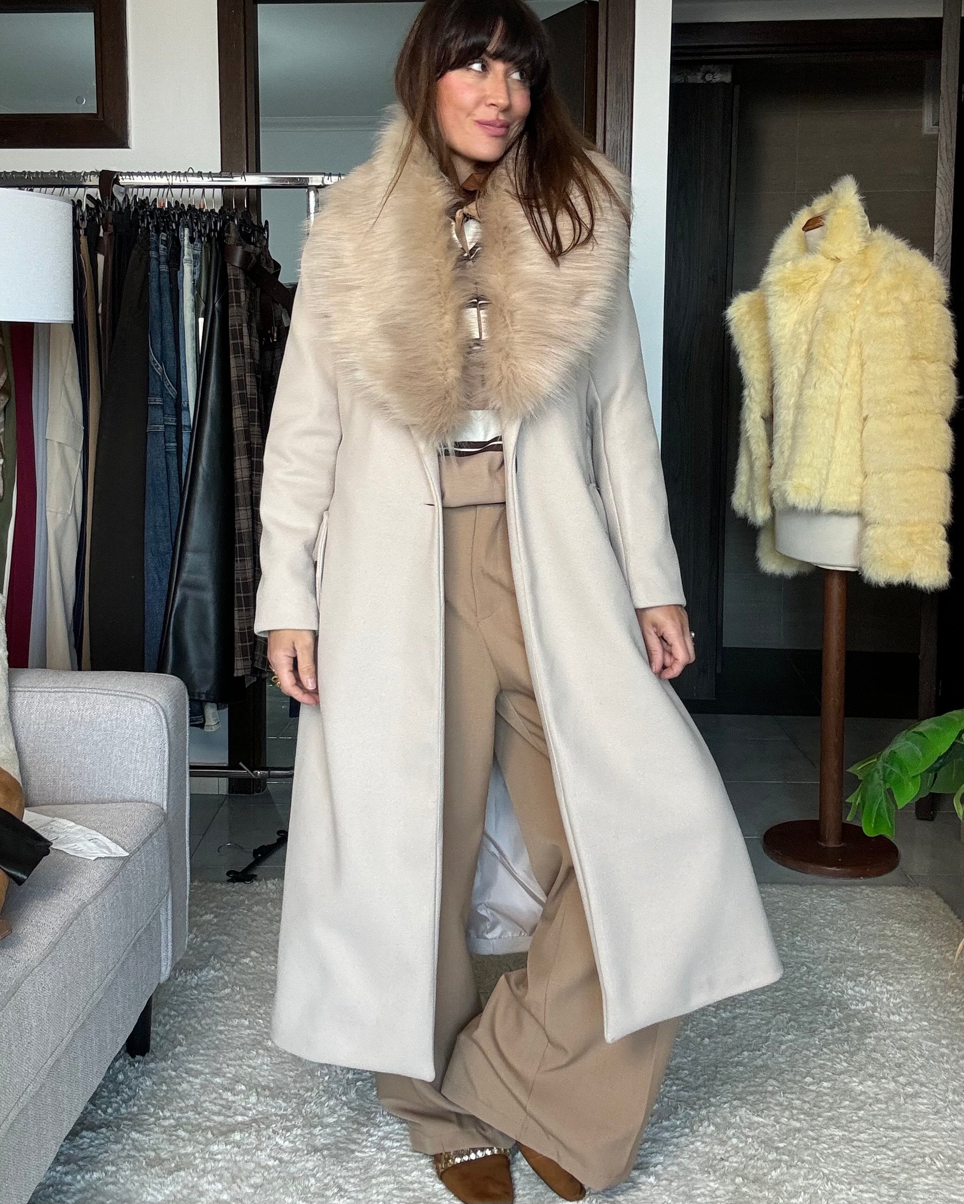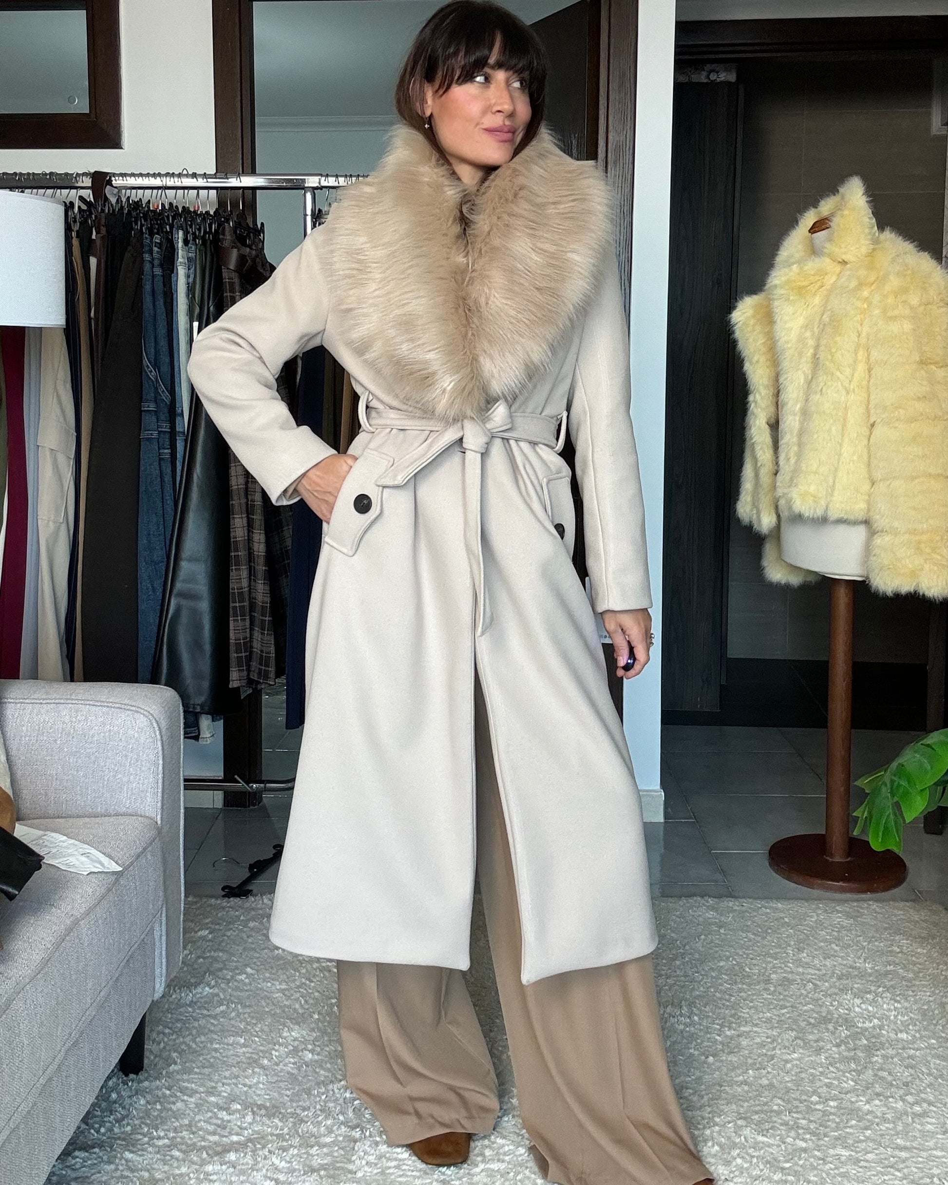 Cappotto lungo da donna elegante in panno di lana a tinta unita con tasche laterali. Colletto con pelliccia sintetica removibile. Chiusura con bottone e cintura in vita.