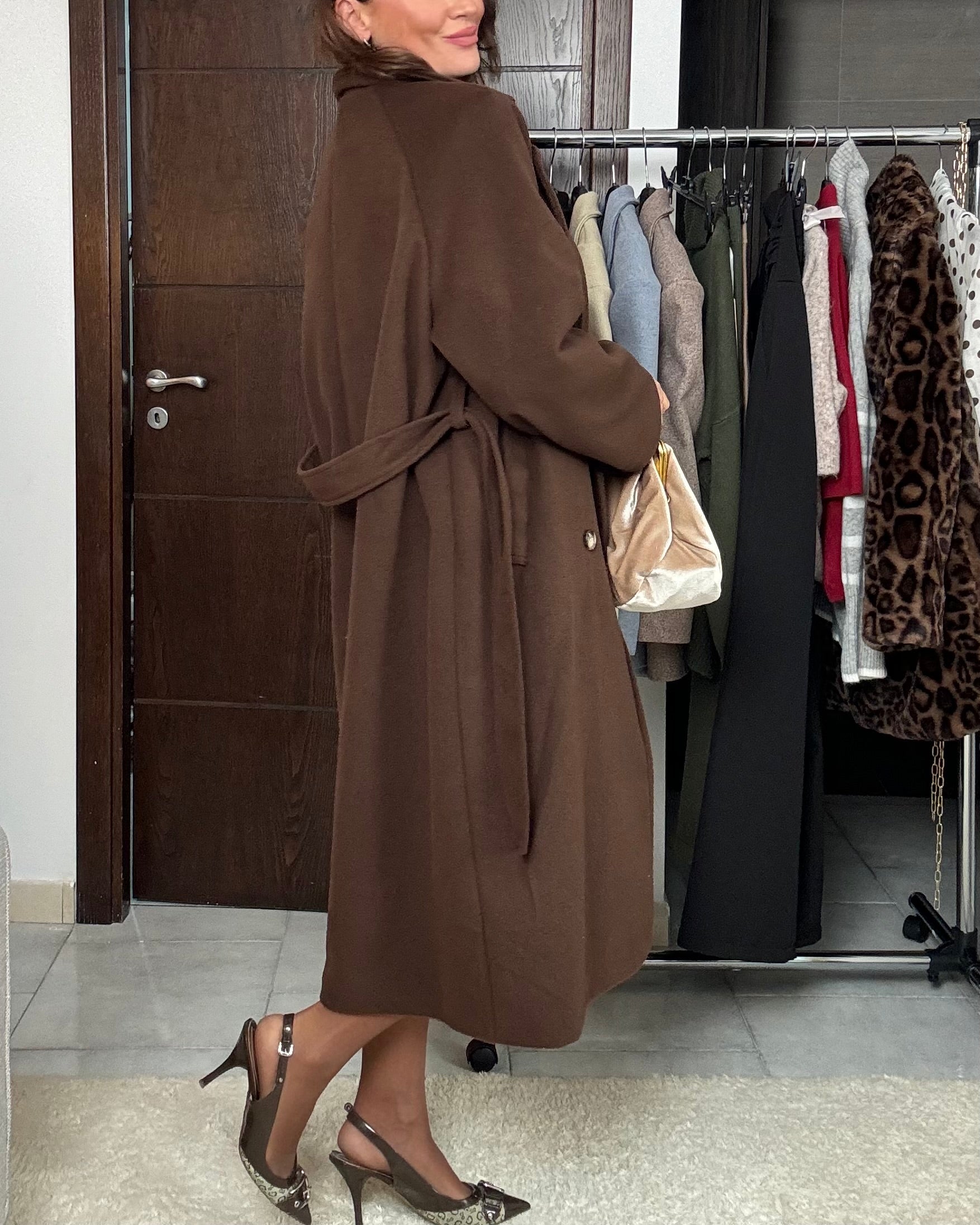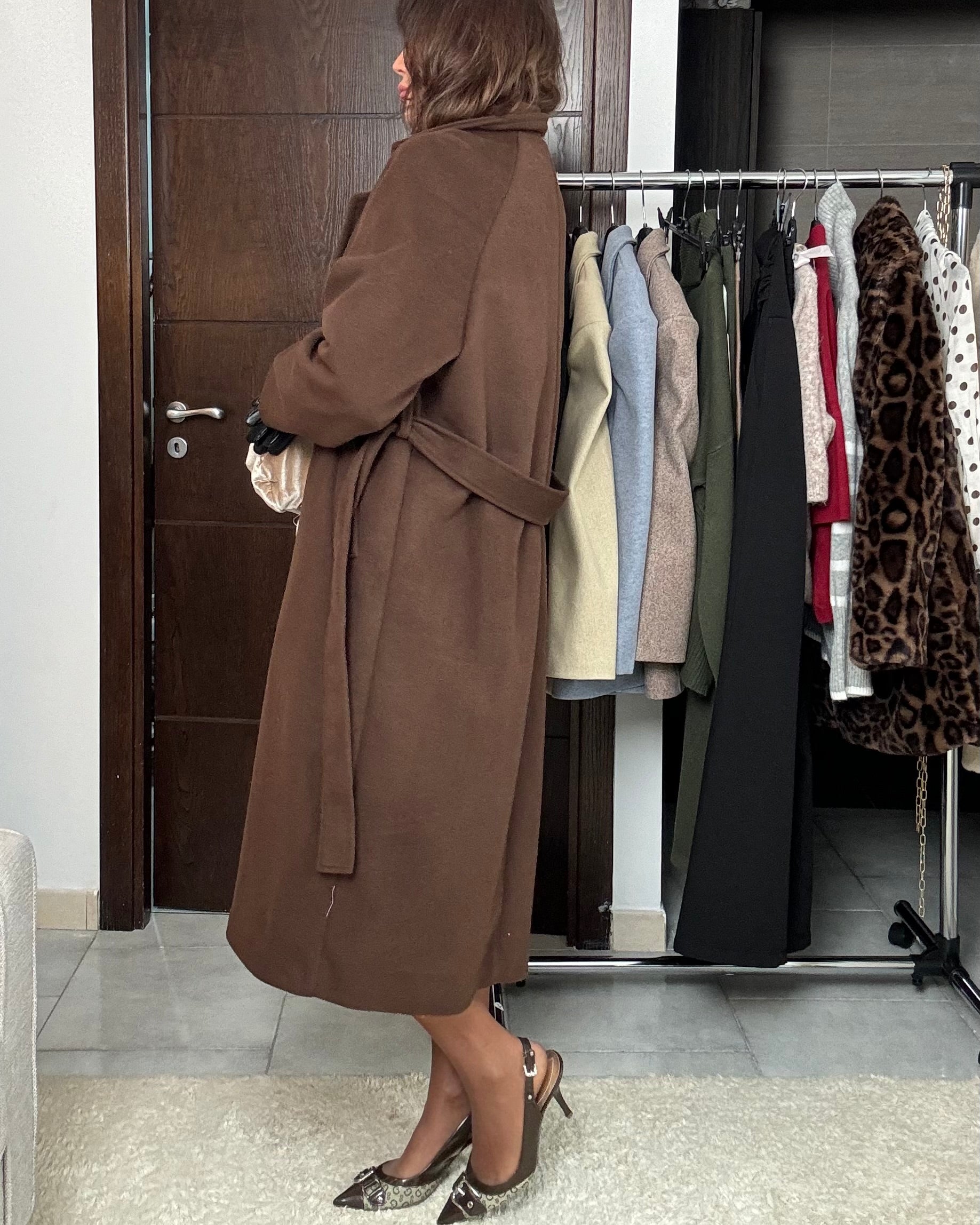 Cappotto con collo a revers e maniche lunghe con passante e bottone. Tasche a filo.