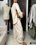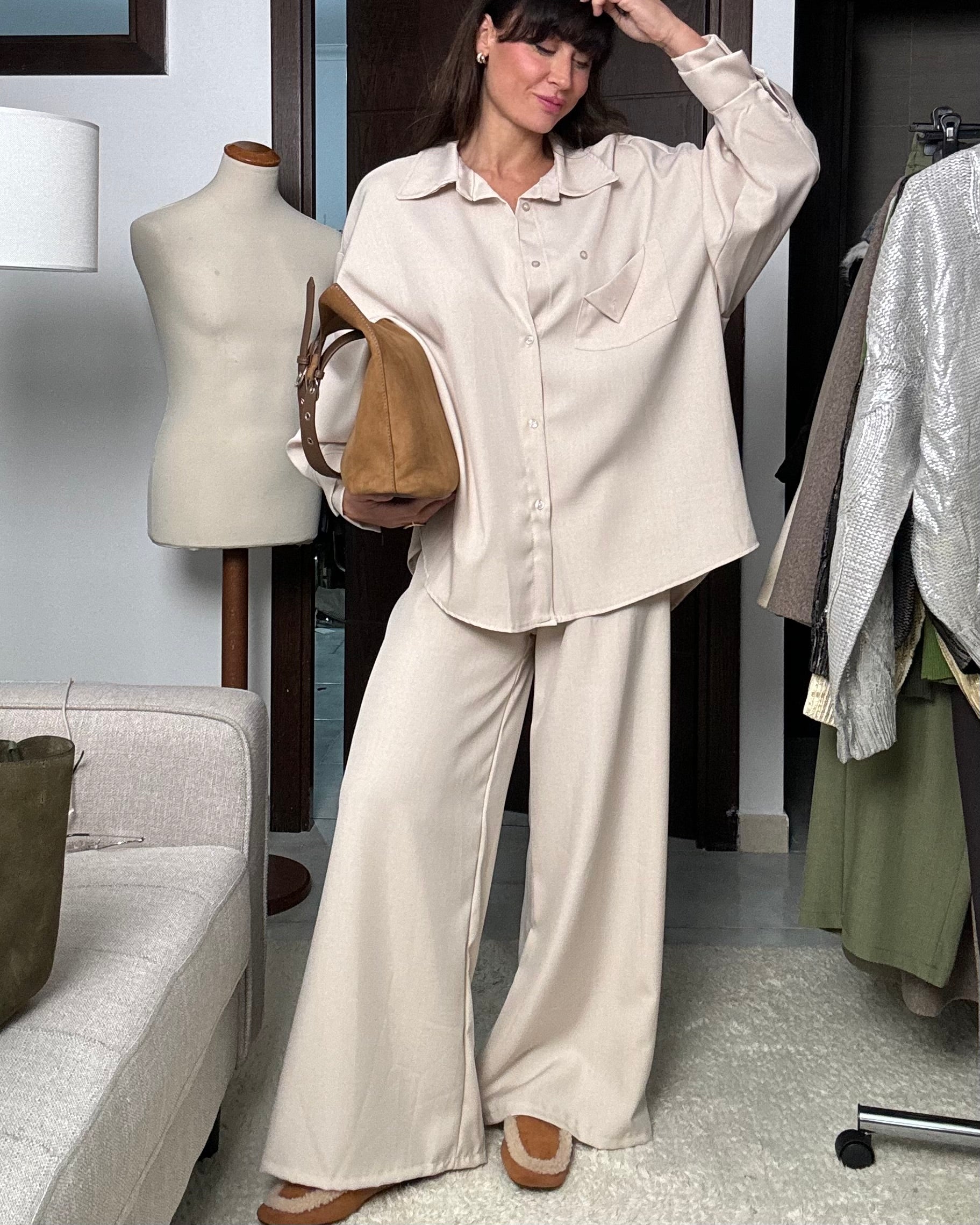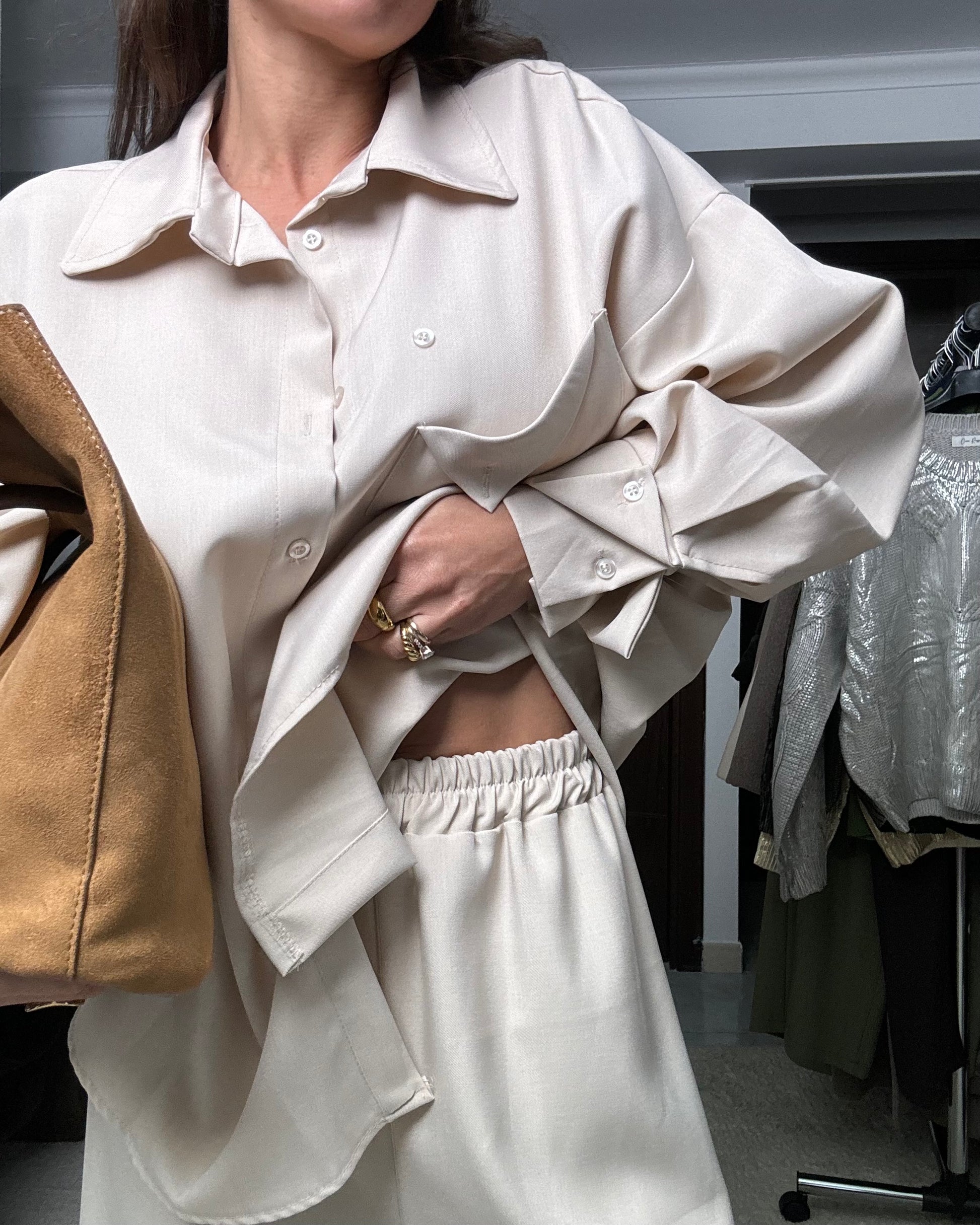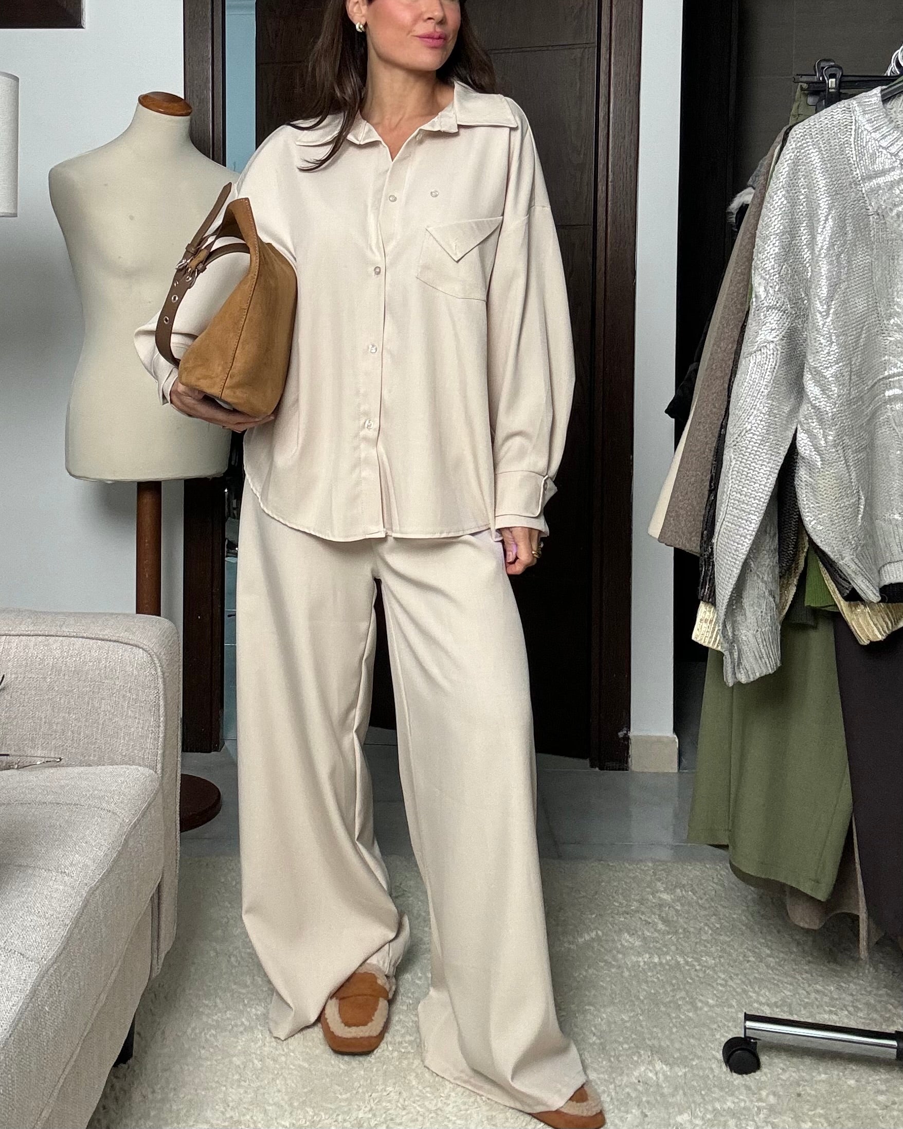 Due pezzi invernale casual composto da Camicia sartoriale ampia con colletto a revers e maniche lunghe. Chiusura frontale con bottoni e taschino .