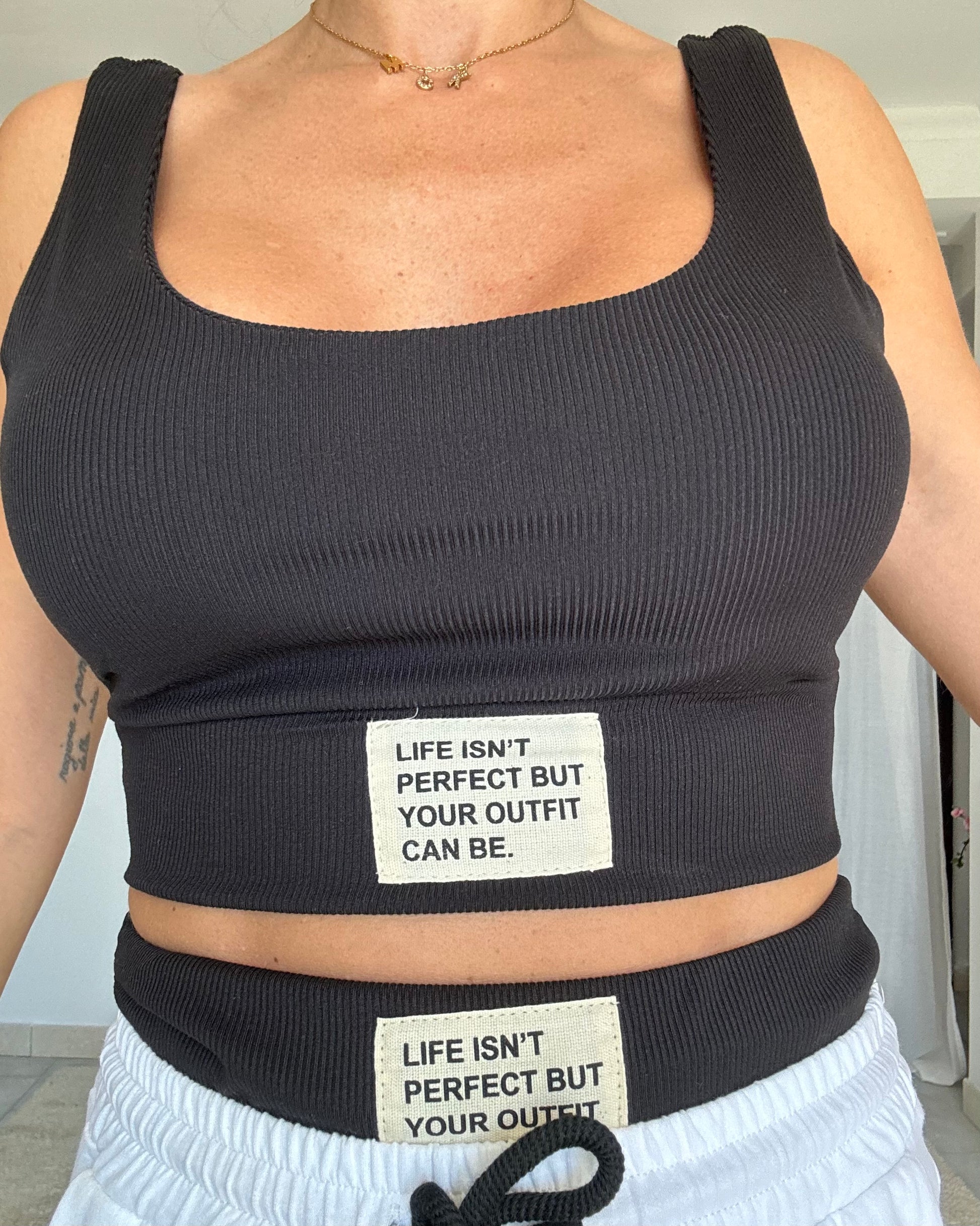 Set composto da pantalone tuta vita alta con coulisse e top a costine e imbottitura effetto pushup.