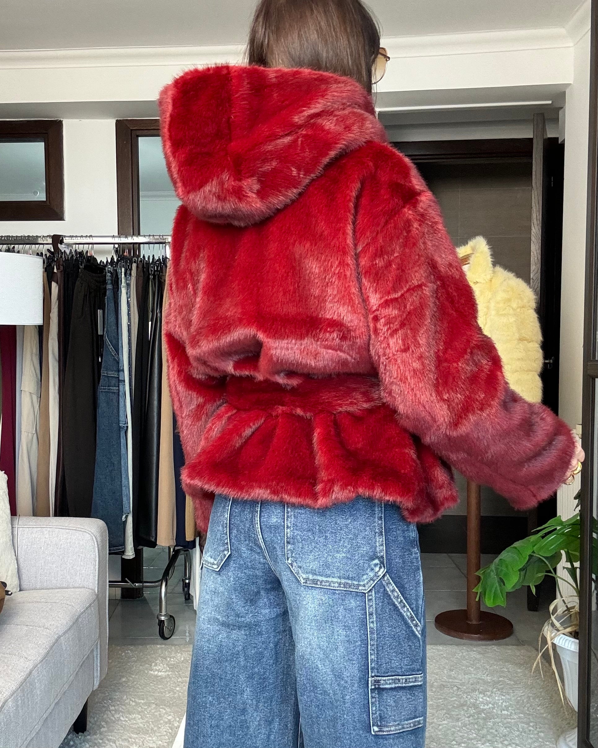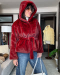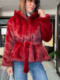 Pelliccia ecologica simil visone effetto realistico, con cintura , passanti e cappuccio incorporato .