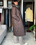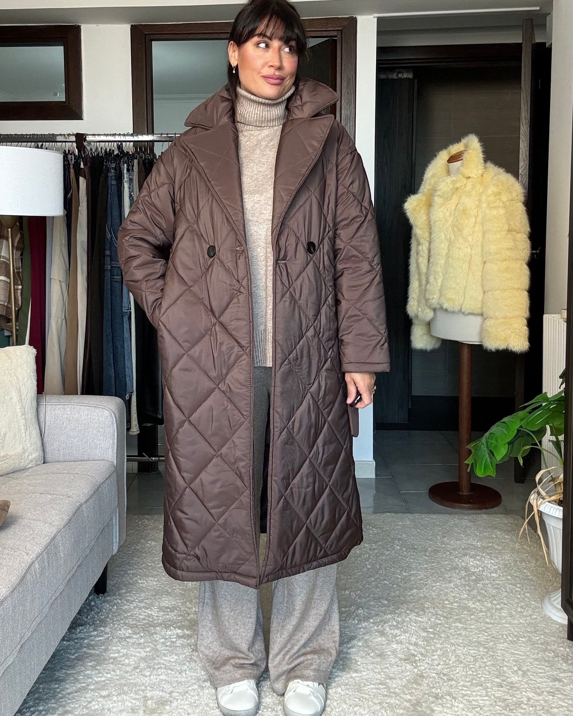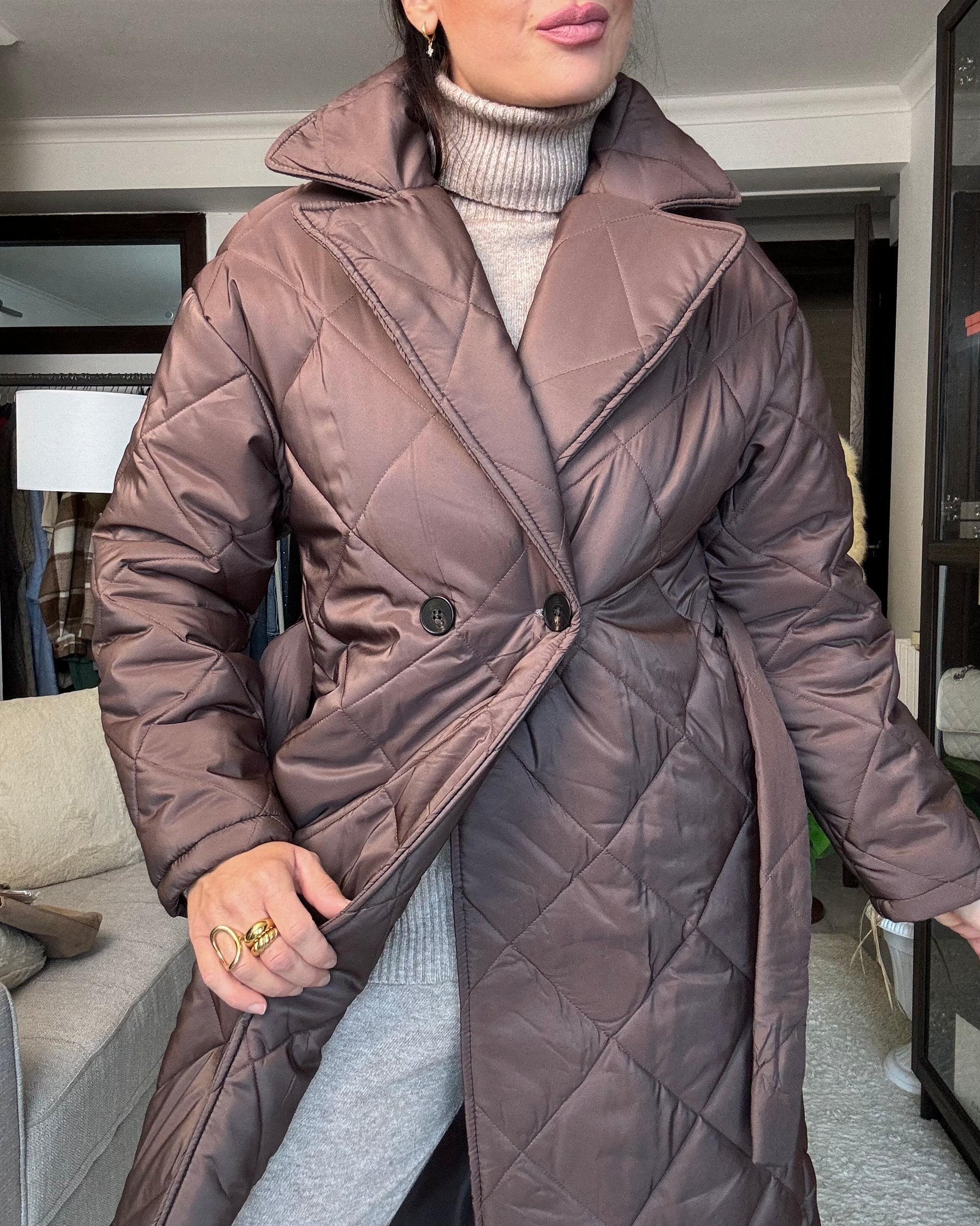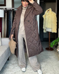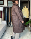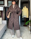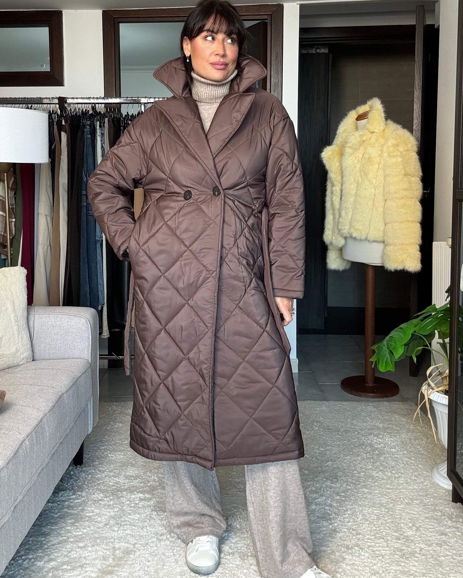 Caldo piumino imbottito lungo con cintura color cioccolato.