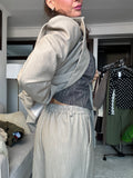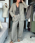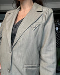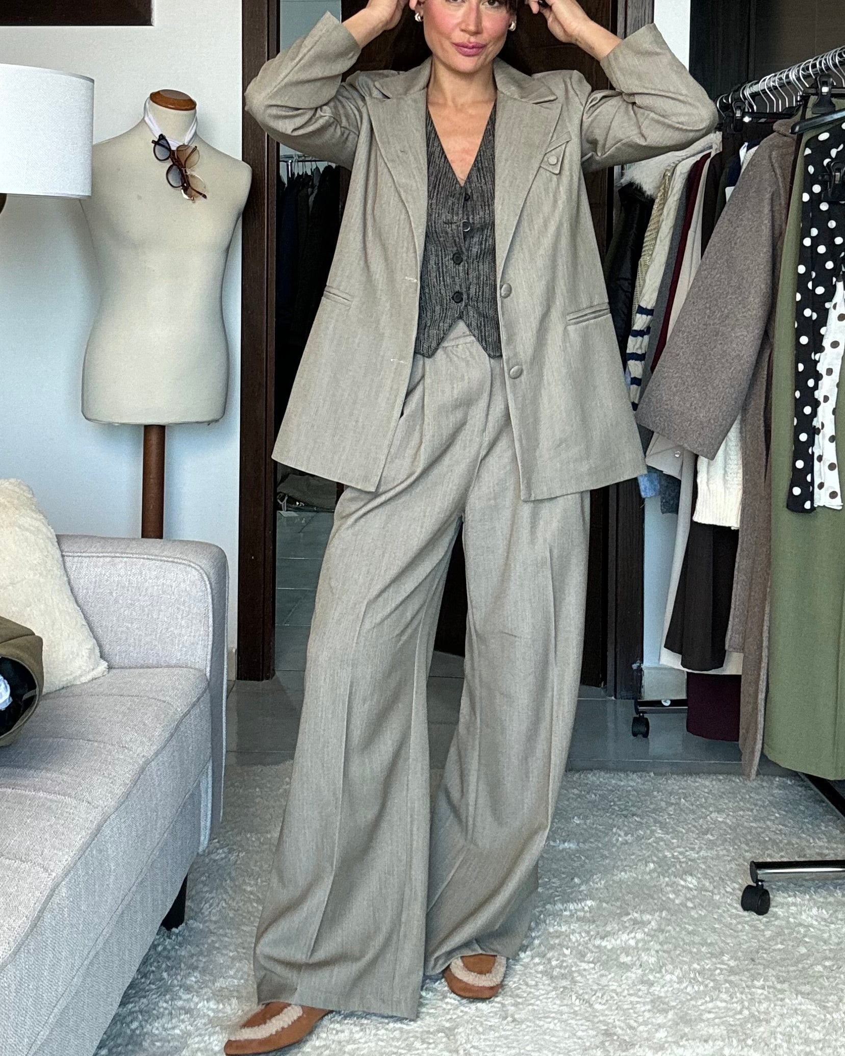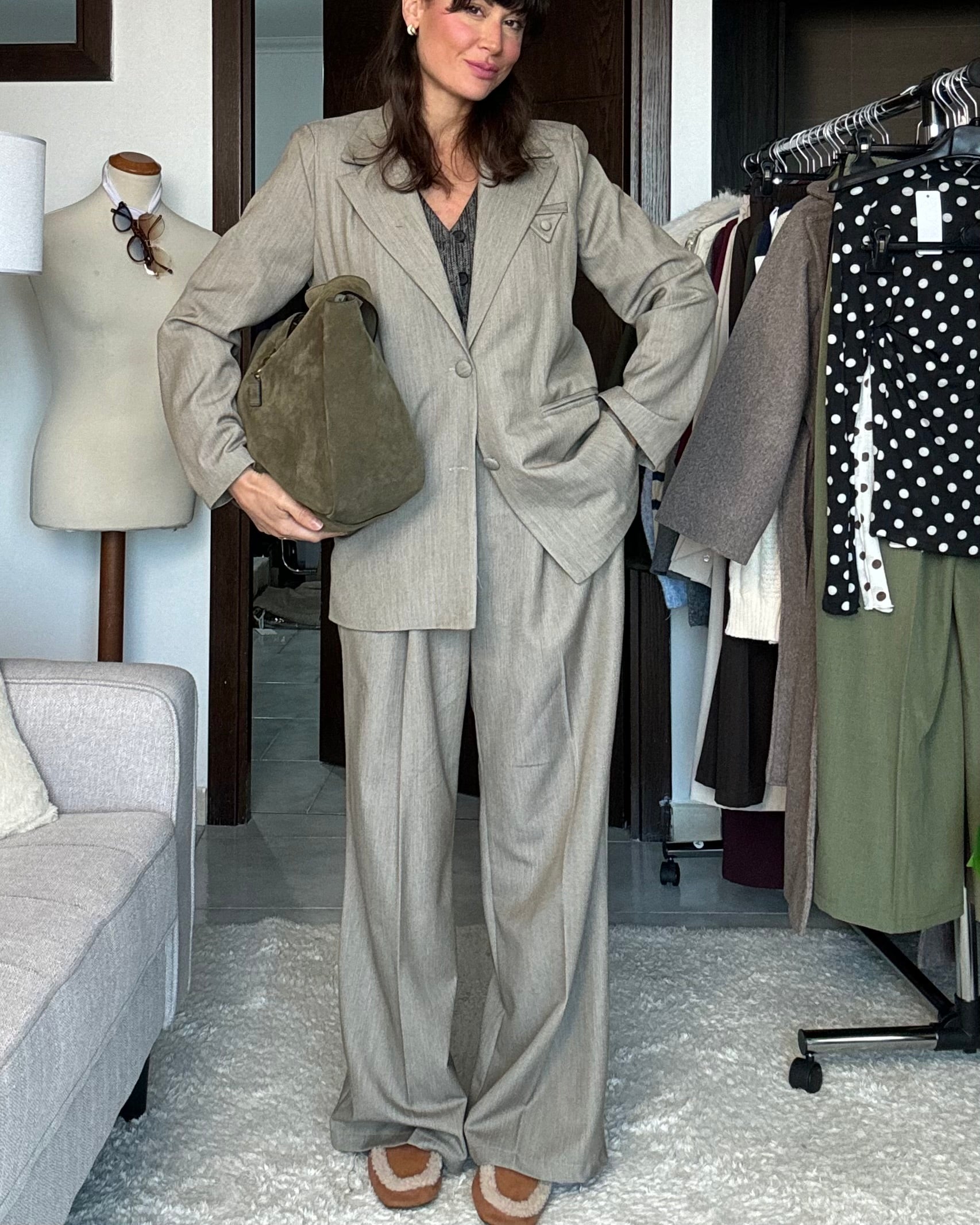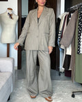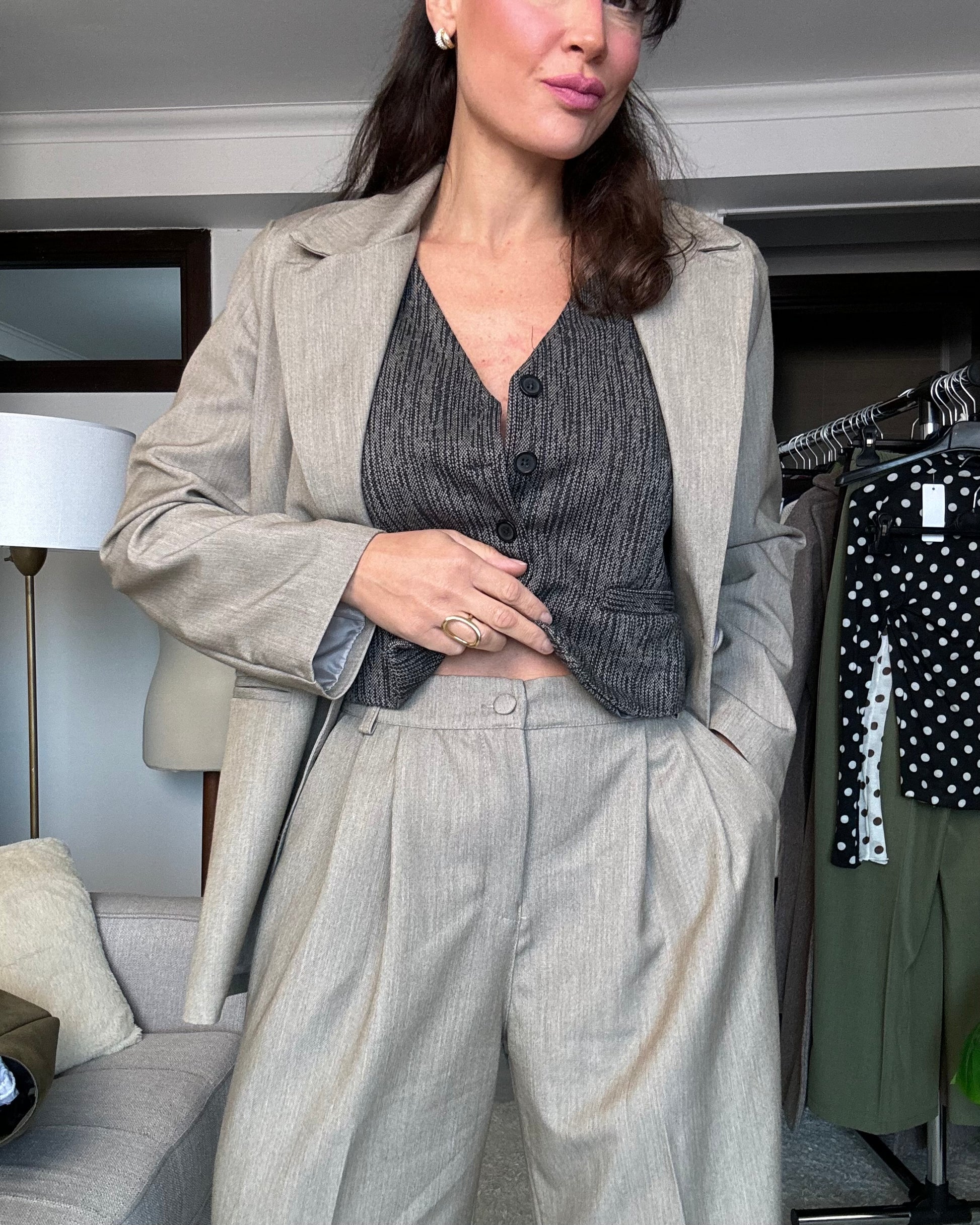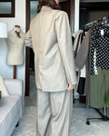 Tailleur dal taglio maschile , giacca dritta due bottoni con spalline e finto taschino .