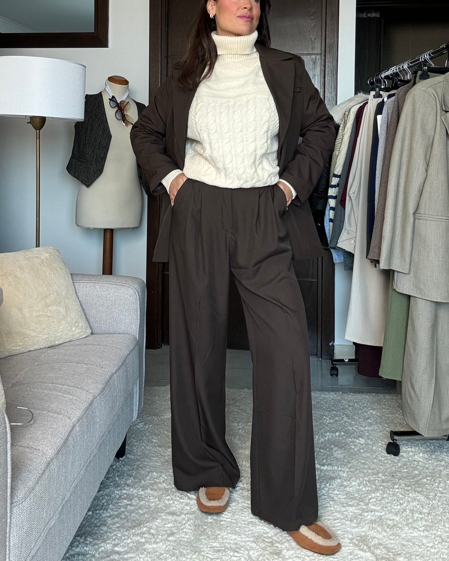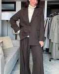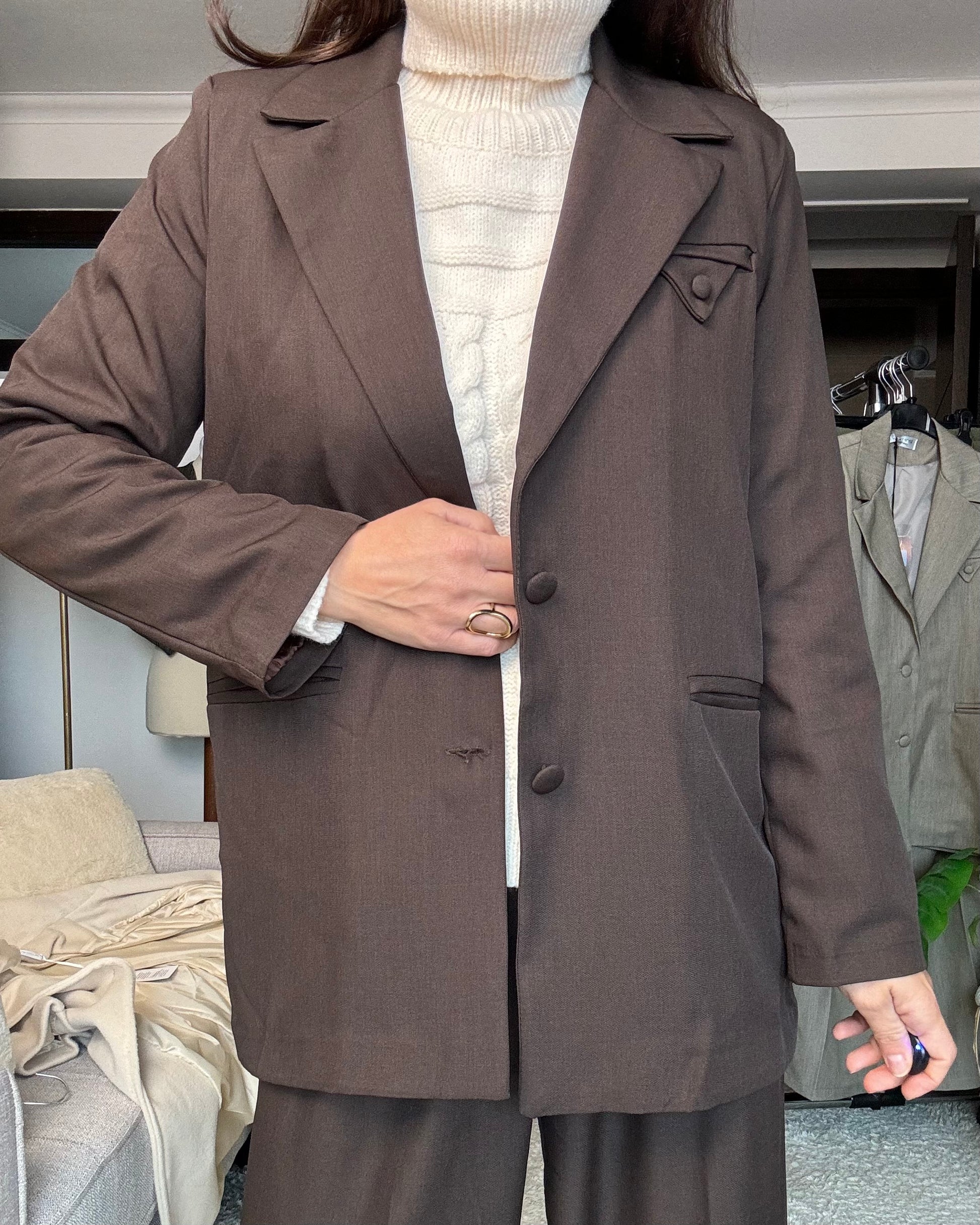 Tailleur dal taglio maschile , giacca dritta due bottoni con spalline e finto taschino .
